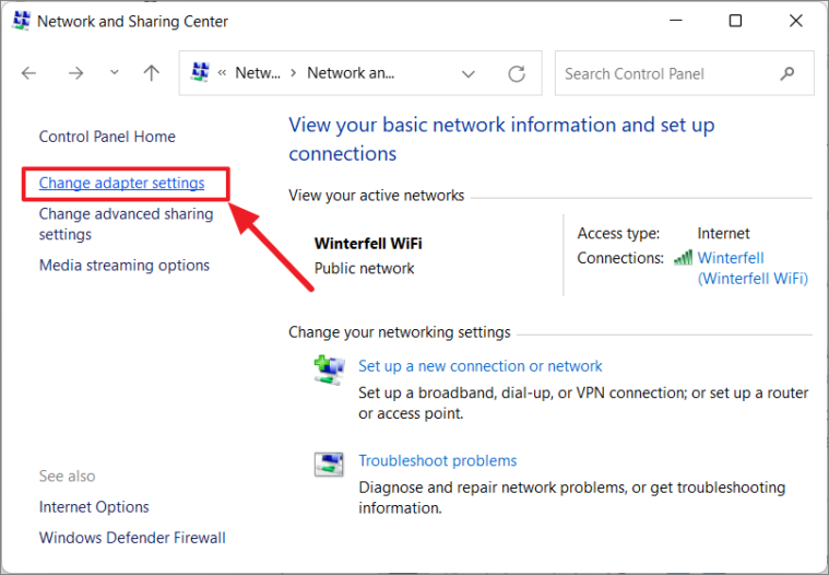 Step 3: In the Network and Sharing Center, click on Change adapter settings on the left pane.