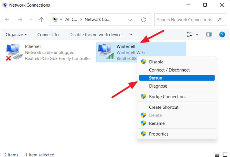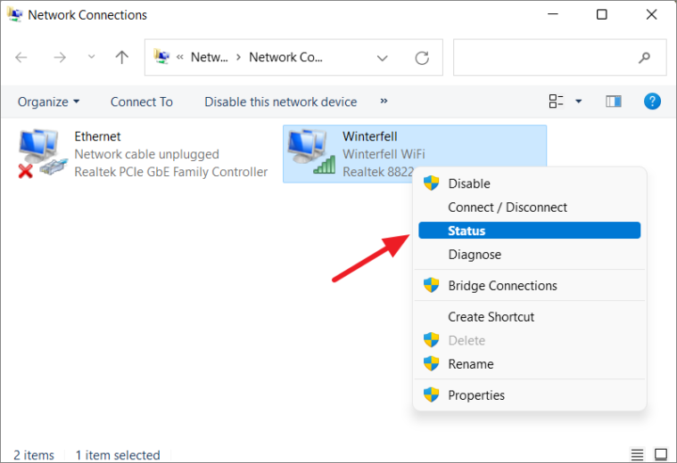 Step 4: In the Network Connections window that opens, right-click on your Wi-Fi adapter and select Status, or simply double-click on the Wi-Fi adapter.