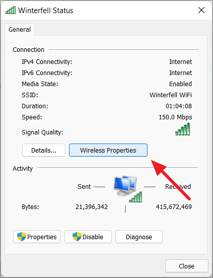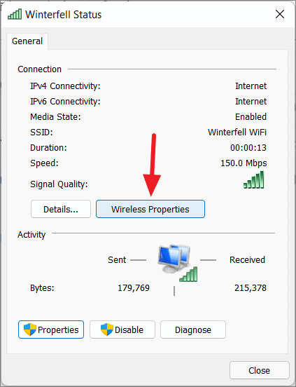 Step 5: Click on Wireless Properties in the Wi-Fi Status dialog.