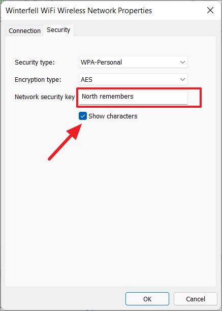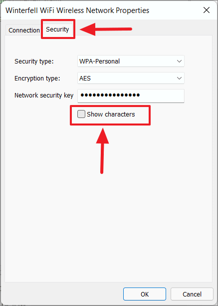 Step 6: Go to the Security tab and check the box next to Show characters to reveal your Wi-Fi password.