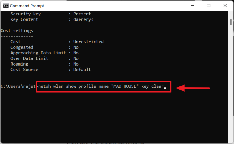 netsh wlan show profile name="MAD HOUSE" key=clear