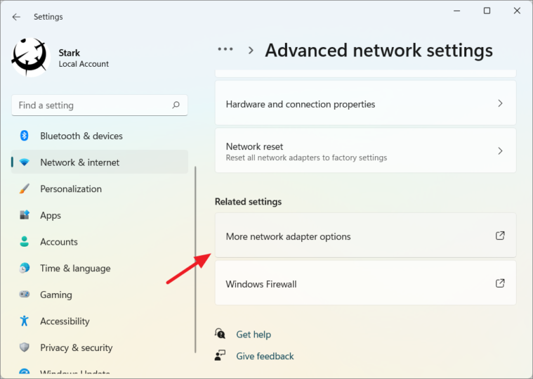 Step 3: Under the Advanced network settings, find and click on More network adapter options under the Related settings section.