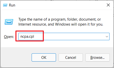 Tip: You can also access the Network Connections window directly by pressing Windows + R, typing ncpa.cpl into the Run dialog, and clicking OK.