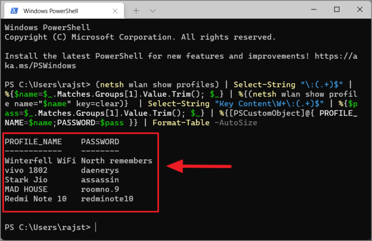 (netsh wlan show profiles) | Select-String "\:(.+)$" | %{$name=$_.Matches.Groups[1].Value.Trim(); $_} | %{(netsh wlan show profile name="$name" key=clear)} | Select-String "Key Content\W+\:(.+)$" | %{$pass=$_.Matches.Groups[1].Value.Trim(); $_} | %{[PSCustomObject]@{ PROFILE_NAME=$name;PASSWORD=$pass }} | Format-Table -AutoSize Step 3: PowerShell will display a table listing all the Wi-Fi profiles saved on your computer along with their passwords under the 'PASSWORD' column.