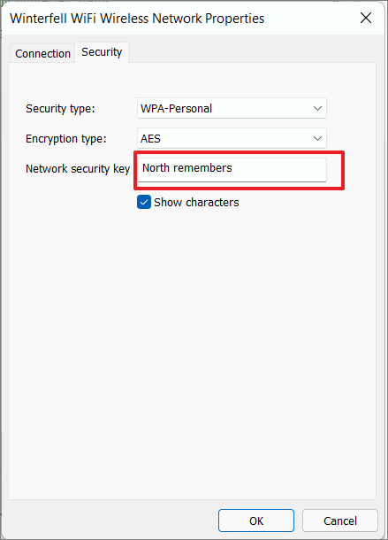 Step 6: Switch to the Security tab, and then check the box next to Show characters. This will reveal the Wi-Fi password in the Network security key field.