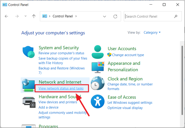Step 2: In the Control Panel, click on View network status and tasks under the Network and Internet category.