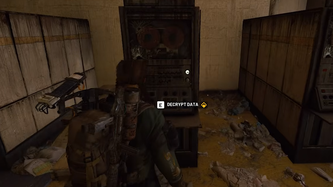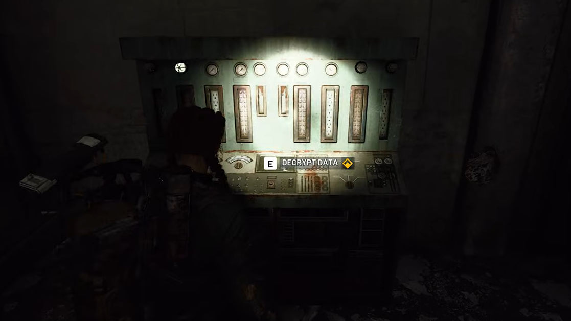 Step 3: Hug the southeast wall and walk to the very end of the room. Look for a distinct electrical device or panel rather than a normal desk terminal. When you are close enough, an interaction prompt to decrypt the data will appear.
