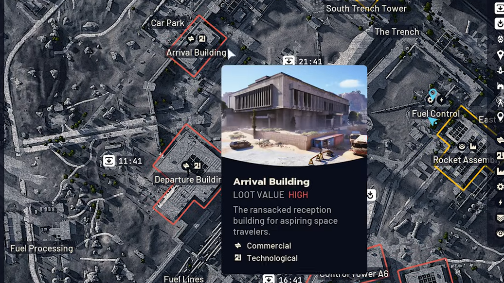 Fuel Control is a low‑value area with mostly mechanical and electrical junk, while the Arrival Building is a high‑value hotspot full of ARC enemies like Pops, Fireballs, and Turrets. Plan your route and loadout around that difficulty spike.