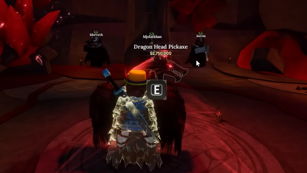 Each heart is a rare drop, with the Yeti Heart and Golem Heart also functioning as high‑multiplier ores you sacrifice to progress. Completing all three cult quests unlocks the ability to purchase the Dragon Head Pickaxe for around 2.75 million coins, with a discount if you switch to the Goblin race beforehand.