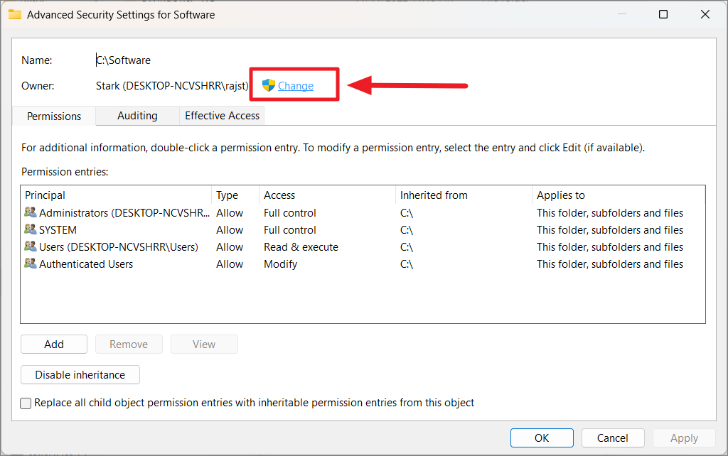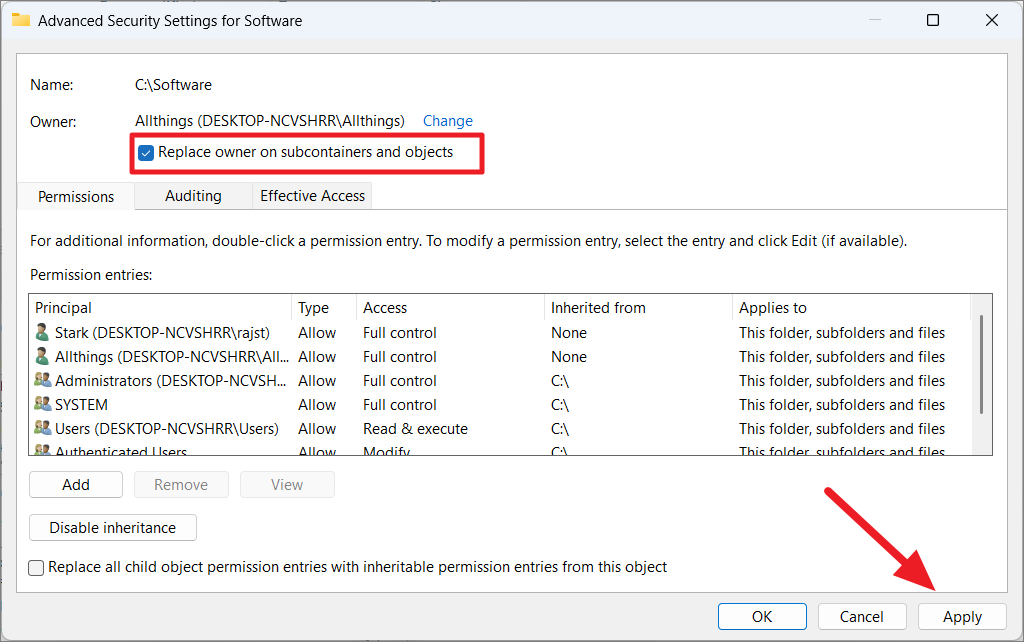 Step 5: Check the box Replace owner on subcontainers and objects, then click Apply and OK.