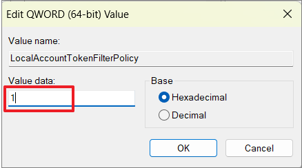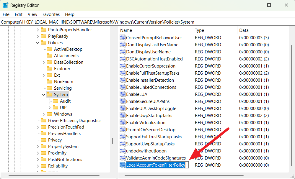 Step 4: Name the new value LocalAccountTokenFilterPolicy.