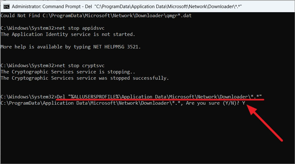 Del "%ALLUSERSPROFILE%\Application Data\Microsoft\Network\Downloader\*.*"If prompted, type Y and press Enter to confirm.