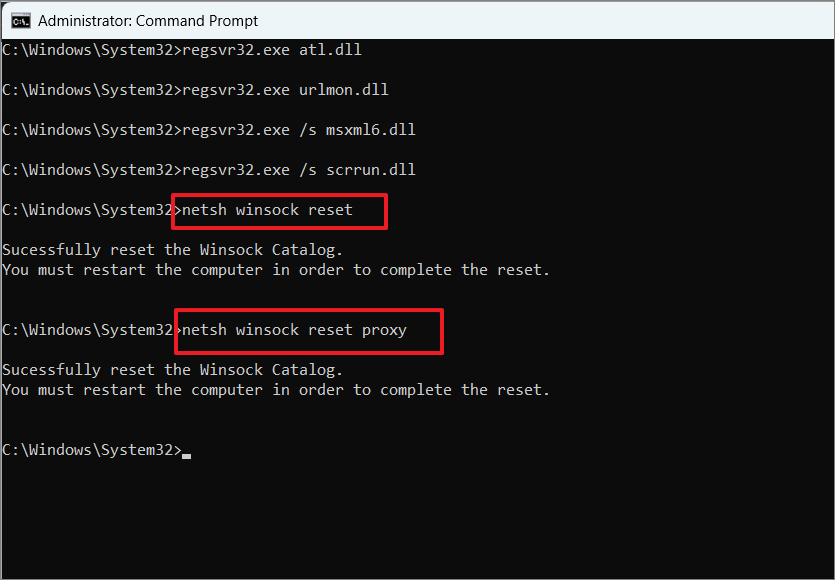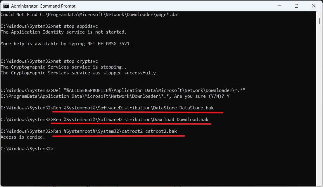 Step 4: Rename the SoftwareDistribution and catroot2 folders by running: