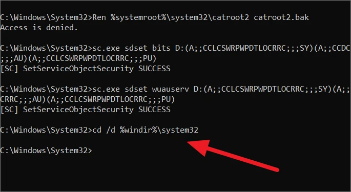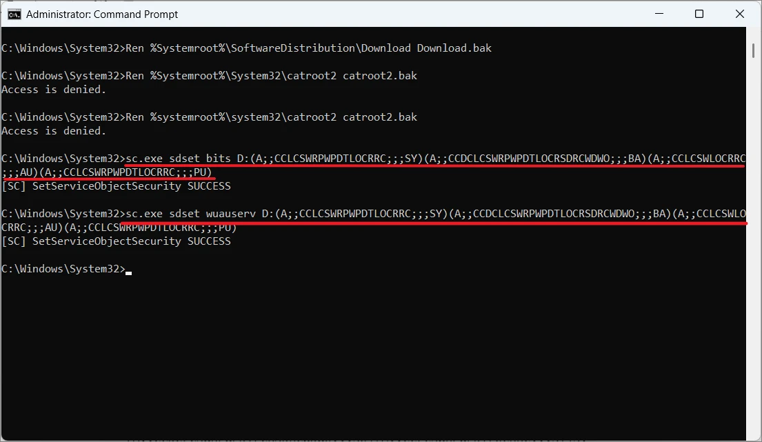 Step 5: Reset BITS and Windows Update services to their default security descriptors with these commands: