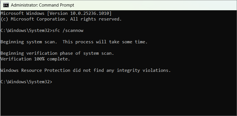 sfc /scannowThis process may take some time. Once completed, you will see a message indicating if any corrupt files were found and repaired.