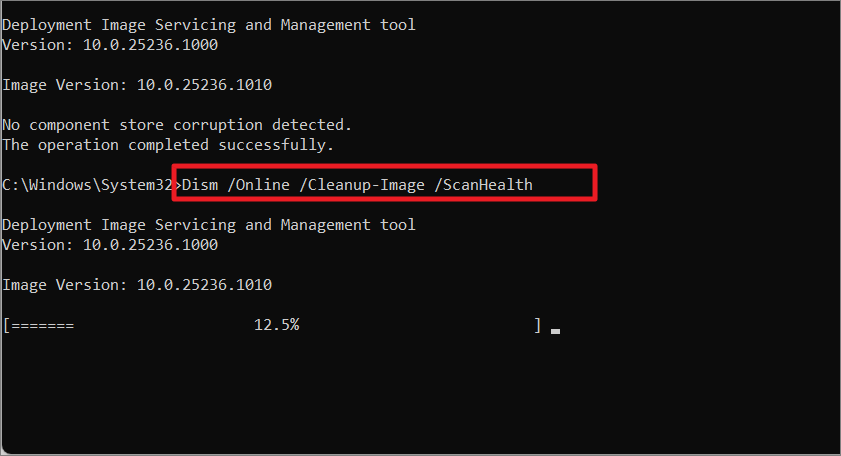 Dism /Online /Cleanup-Image /ScanHealthThis may take several minutes.
