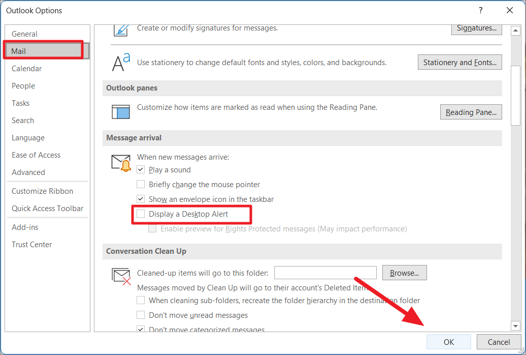 Step 3: Scroll to Message arrival and uncheck Display a Desktop Alert.