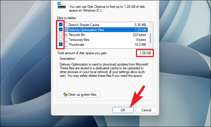 Step 3: Check the boxes next to the types of files you want to delete. Review the total amount of space you will free up, then click OK.