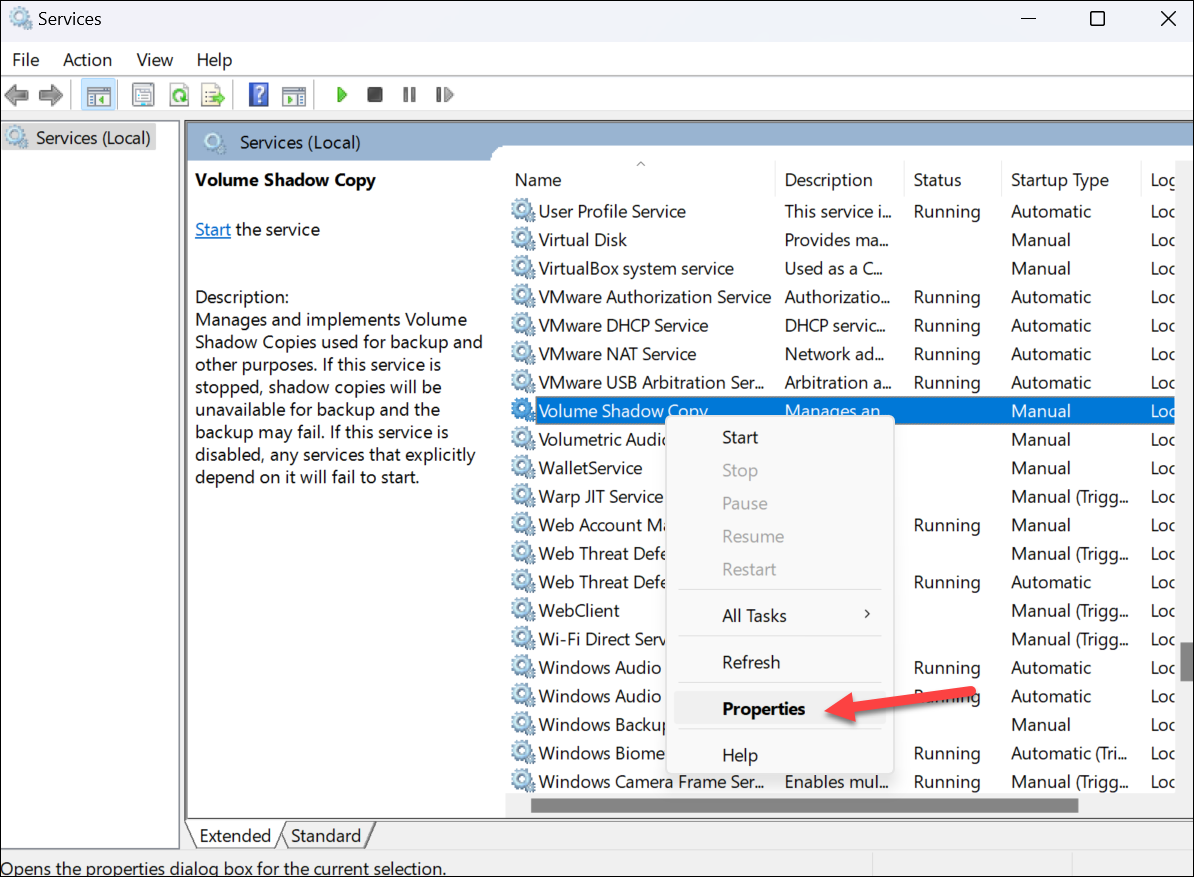 Step 3: Right-click on Volume Shadow Copy and select Properties from the context menu.