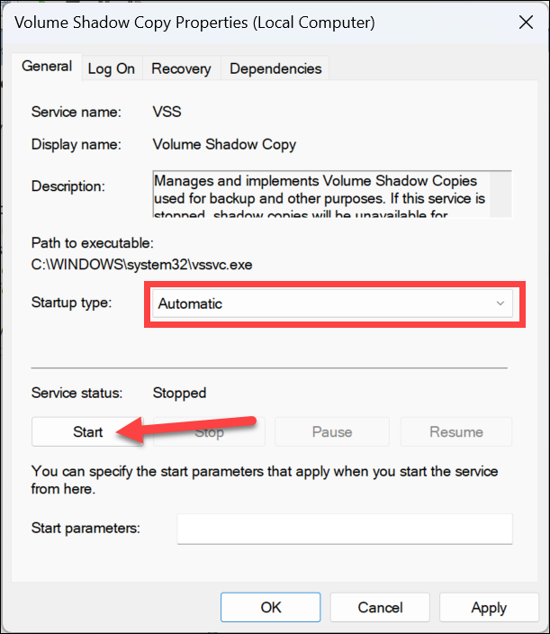 2. Restart the Volume Shadow Copy Service
