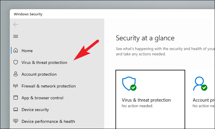 Step 2: In the Windows Security window, select Virus & threat protection from the left pane.