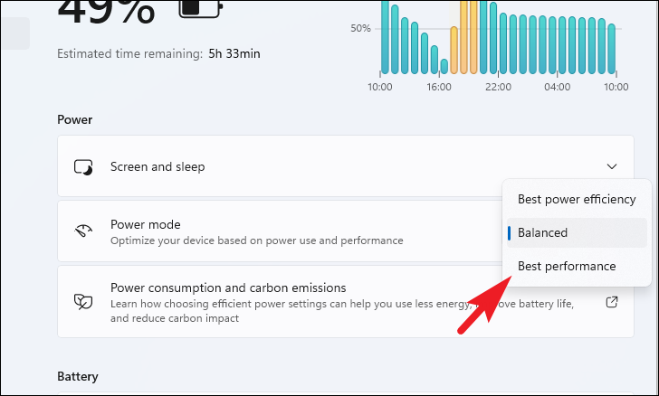 Step 3: Under the Power section, locate the Power mode setting. Click on the dropdown menu and select Best performance from the options.