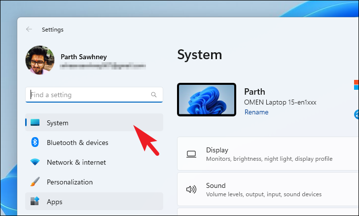 Step 2: In the Settings window, select System from the left sidebar, then click on Display in the right pane.
