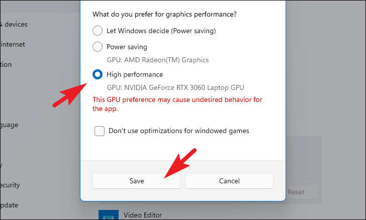 Step 6: In the Graphics preference window, select the High performance option, which uses the dedicated graphics card. Click on Save to apply the changes.