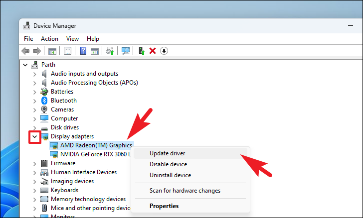 Step 2: In the Device Manager window, locate and expand the Display adapters section by clicking the arrow next to it. Right-click on your primary graphics card and select Update driver from the context menu.
