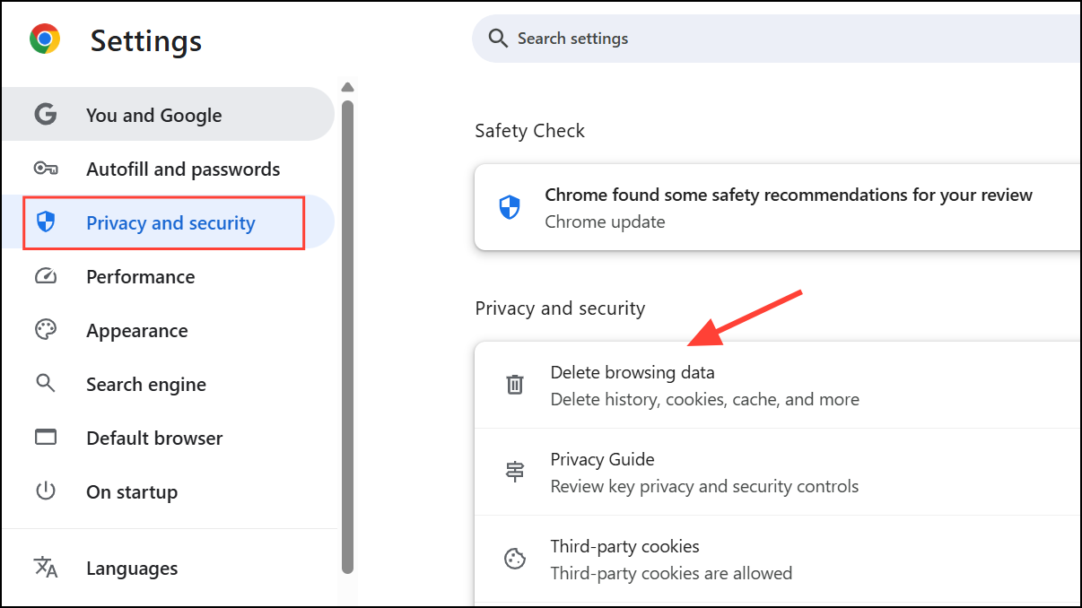 Step 1: In Google Chrome, click the three vertical dots in the top right corner and go to Settings > Privacy and Security > Delete browsing data.