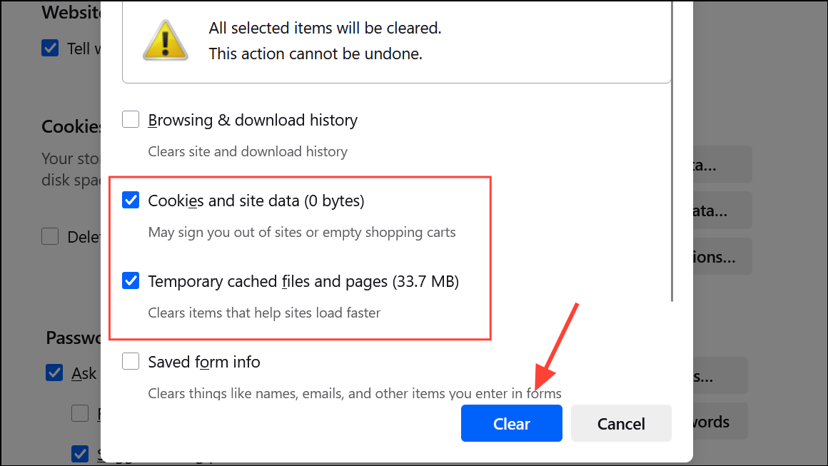For Mozilla Firefox, access the menu via the three-bar icon, select Options, then Privacy & Security. Under Cookies and Site Data, click Clear Data, ensure both options are checked, and confirm with Clear.