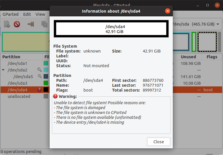 As we can see in the above image, the partition /dev/sda4 is the erroneous NTFS partition, and its file system is unknown to Gparted. The warning sign indicates that there is some issue with this partition. Double click on this row to see details of the warning.