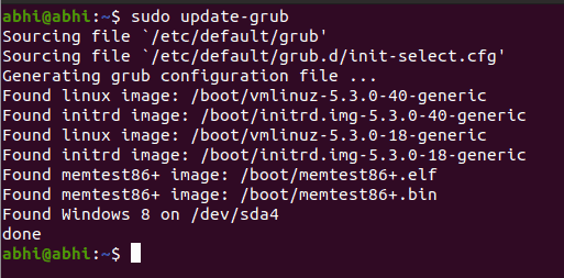 Here /media/abhi/win is the directory location where the NTFS partition has been mounted. Finally, we update the grub, so that it detects the bootable Windows operating system on the recovered partition.