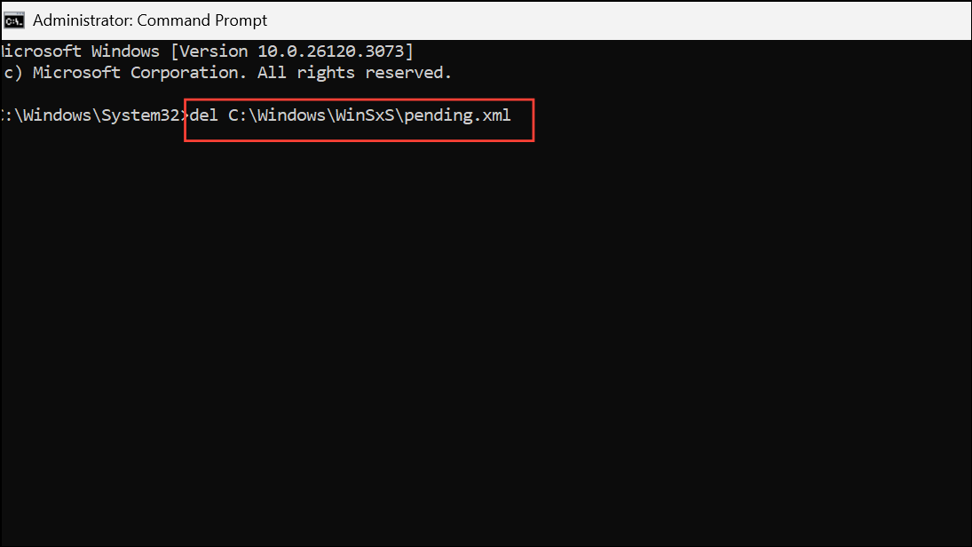 Replace C:\ with the drive letter where Windows is installed if it differs. This step rolls back incomplete update or repair attempts, clearing the queue that prevents SFC from running.