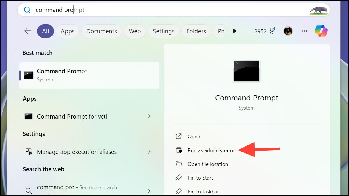 Step 1: Open Command Prompt as an administrator. Type cmd in the search bar, right-click on Command Prompt, and choose Run as administrator.
