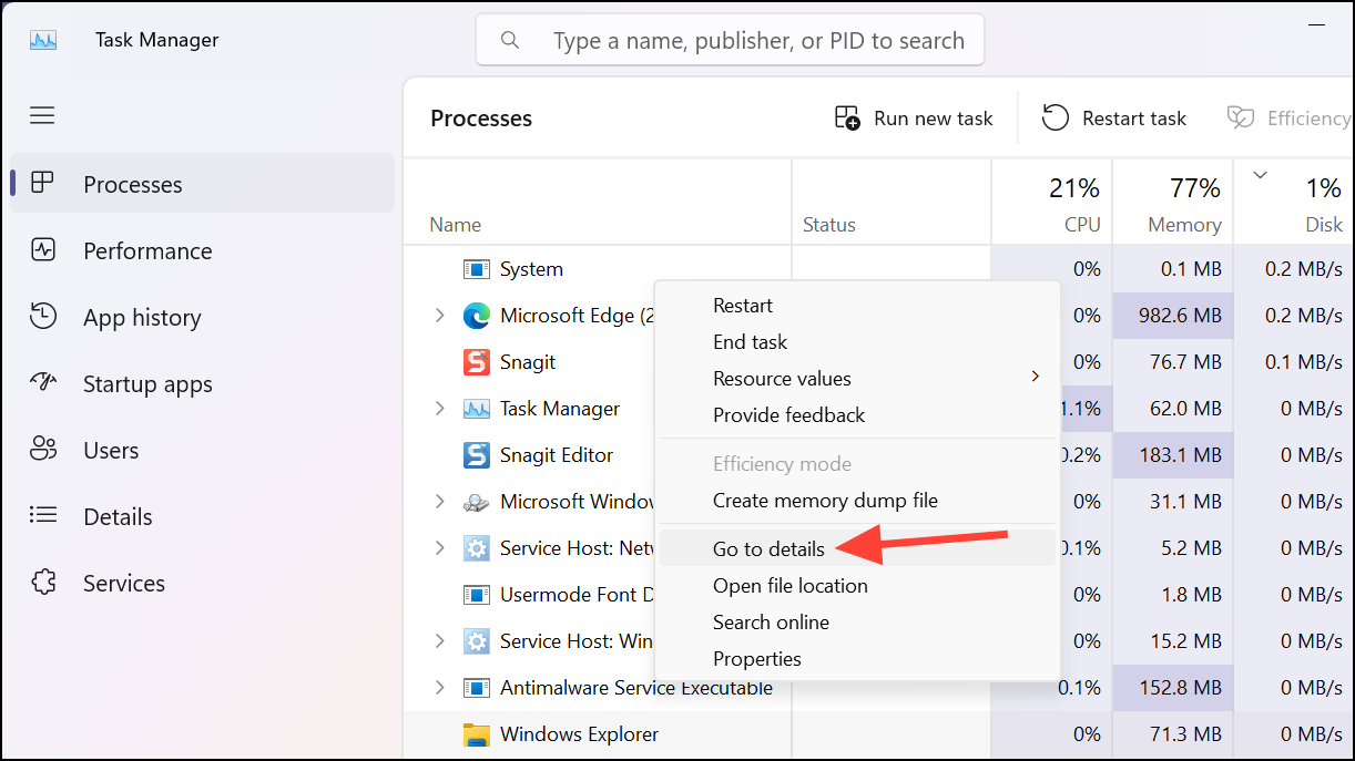 Step 4: If you're unsure of the process name, open Task Manager, right-click on the problematic process, and select Go to details.