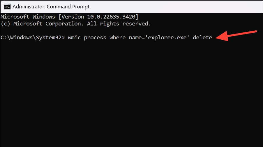Replace 'processname.exe' with the actual name of the process (including the single quotes). For example, to terminate File Explorer, use: wmic process where name='explorer.exe' call terminate