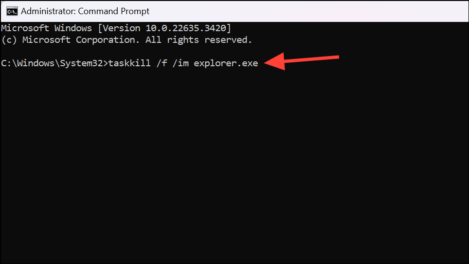 Replace processname.exe with the actual name of the process you want to terminate. For example, to terminate File Explorer, you would type: taskkill /f /im explorer.exe