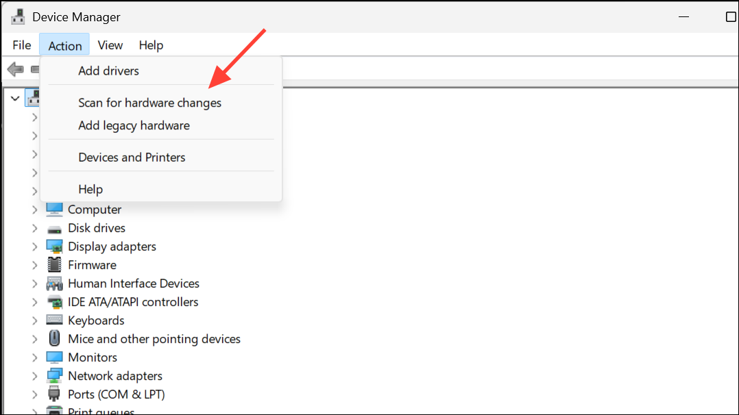 Step 3: At the top of Device Manager, click the Action menu and choose Scan for hardware changes. Windows will search for any missing drivers or hardware and attempt to reinstall them. If your speakers reappear, test audio output immediately.