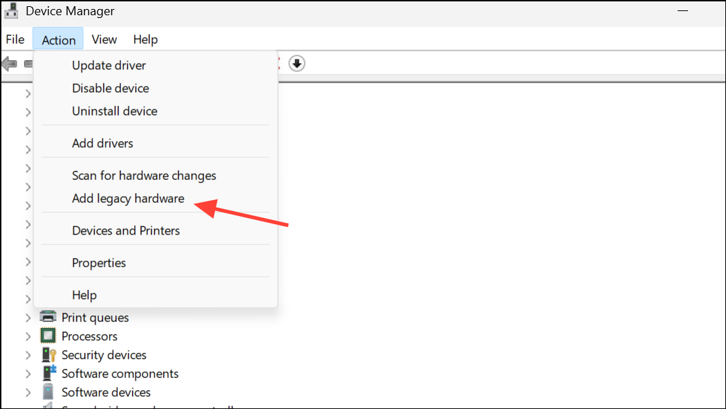 Step 4: If the device does not show up at all, use Add legacy hardware in Device Manager’s Action menu to manually install a generic audio driver. Follow on-screen prompts to select and install a compatible driver.