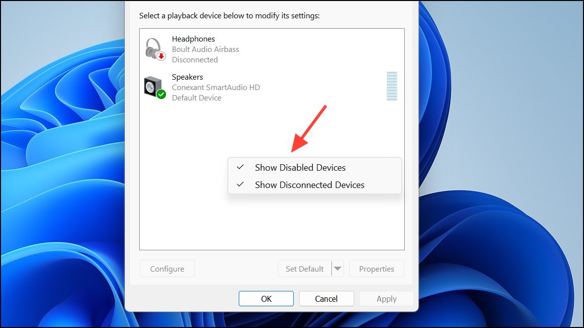 Step 3: In the Playback tab, right-click in the device list and ensure Show Disabled Devices and Show Disconnected Devices are checked. If your speakers appear but are disabled, right-click and select Enable. Then, right-click again and choose Set as Default Device.