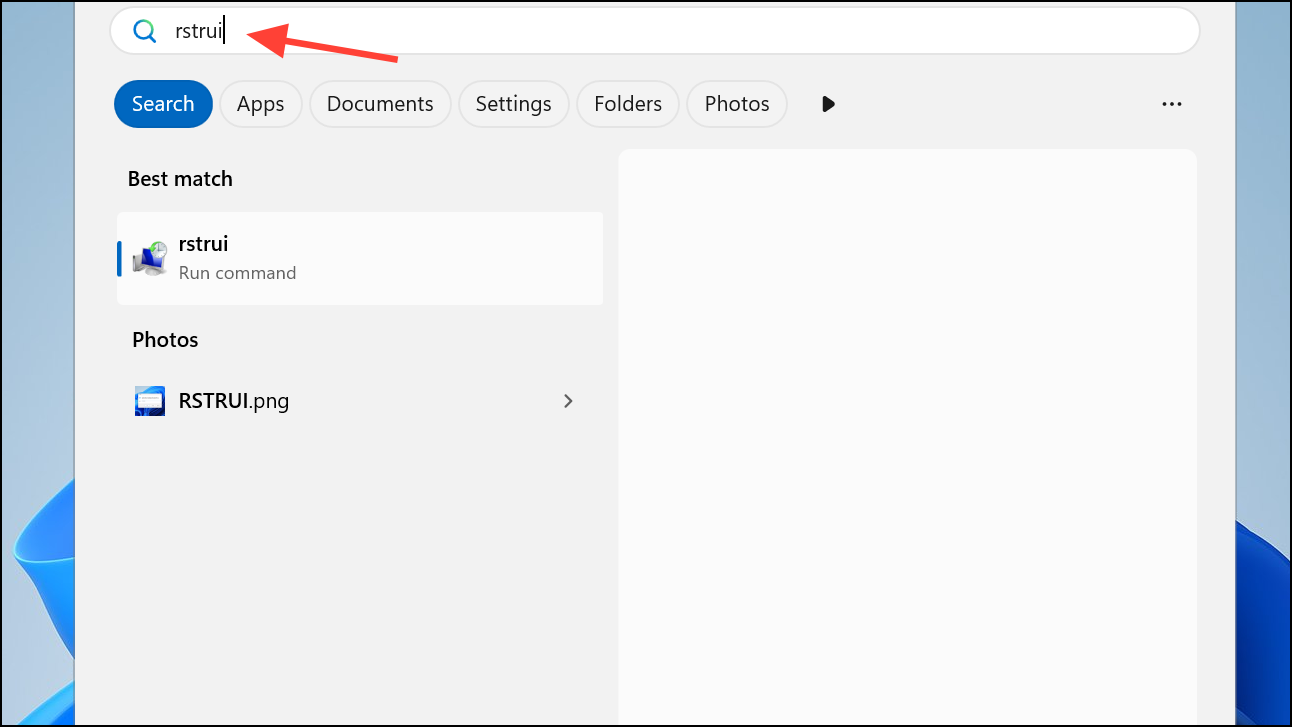 Step 1: Type rstrui in the Windows search bar and press Enter to launch System Restore.