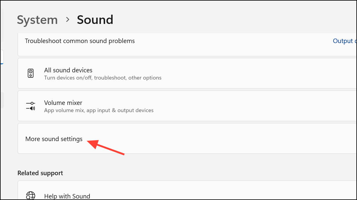 Step 2: Scroll down the Sound Settings page and click More sound settings to open the classic Control Panel sound dialog box.