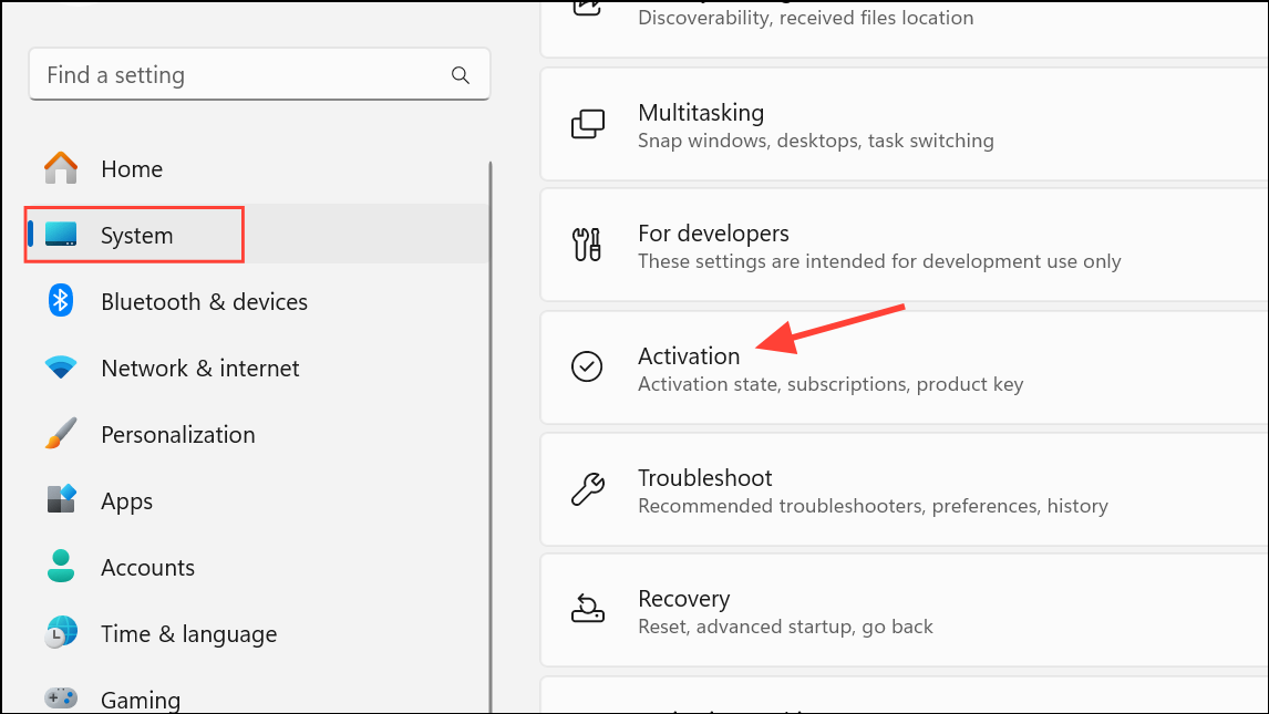 Step 2: Navigate to System and select Activation. On this screen, Windows displays your current activation status and any error messages.