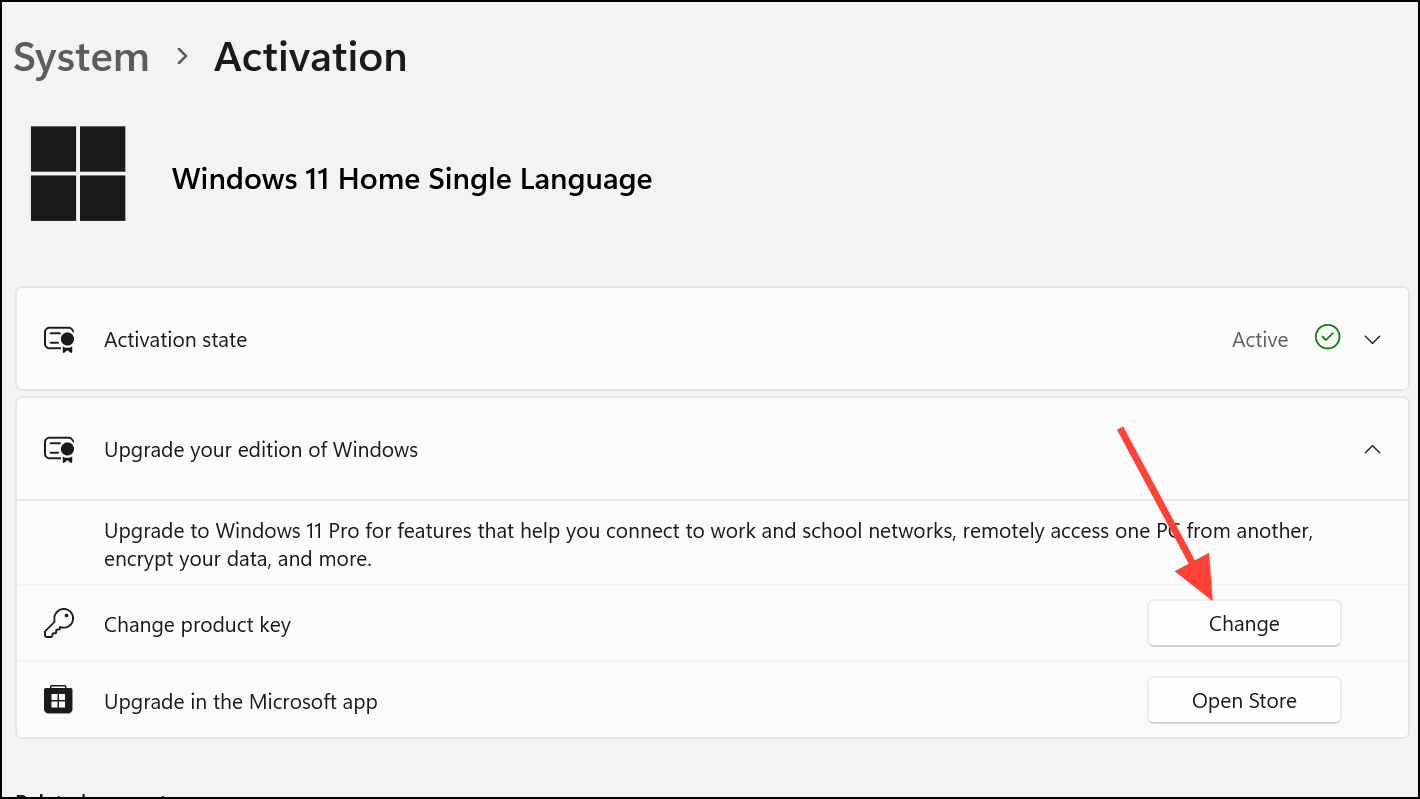 Step 1: In the Settings > System > Activation panel, click Change product key.