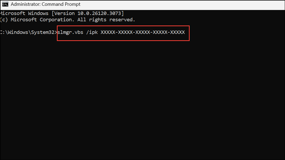slmgr.vbs /ipk XXXXX-XXXXX-XXXXX-XXXXX-XXXXXReplace the Xs with your actual product key. Press Enter to submit the key.