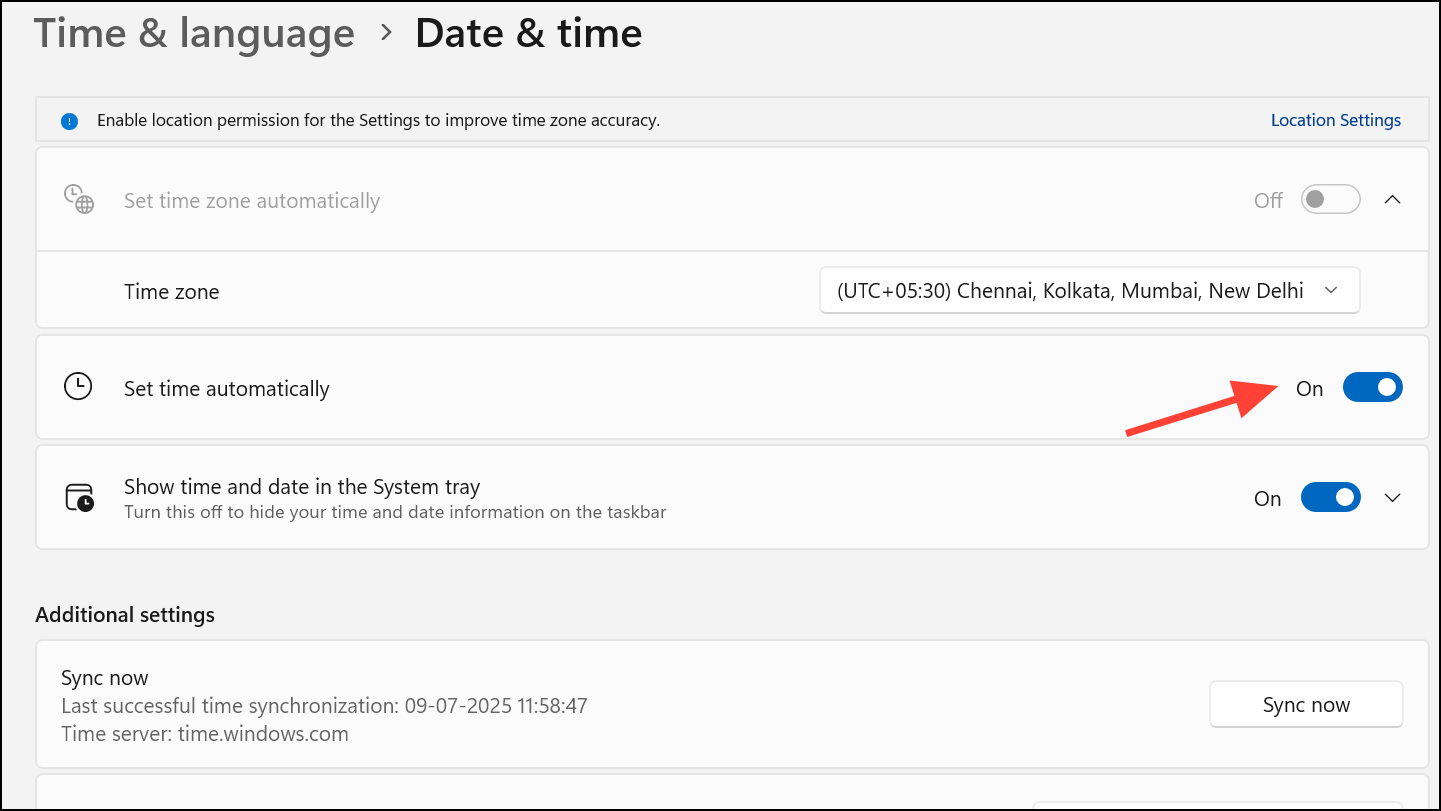 Step 2: Enable Set time automatically and Set time zone automatically. This ensures your system clock is accurate.