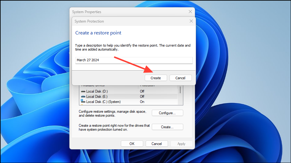 - Clicking on the 'Create' button will bring up a pop-up asking you to provide a name for the restore point. Enter any name you like, preferably one that will help you remember when the restore point was created, and click on the 'Create' button.
