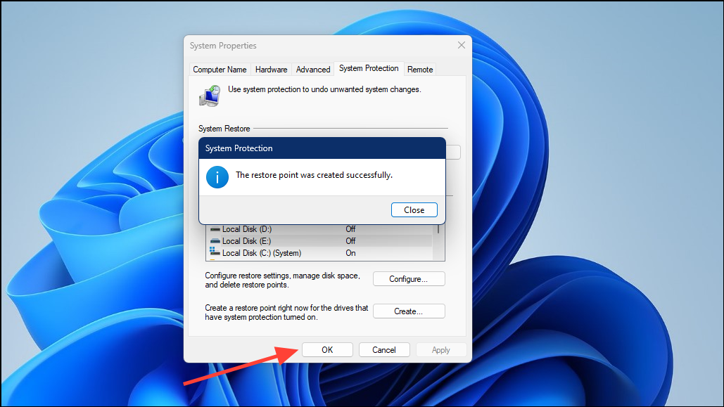- Windows will show a notification informing you that the restore point was created successfully. Click on the 'Close' button and then on the 'OK' button.