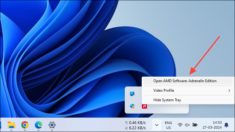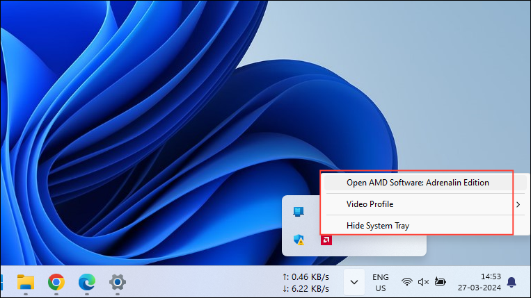 - Right-click on the AMD Software icon and it will show you three options - open the software, edit the video profile, and hide the system tray.